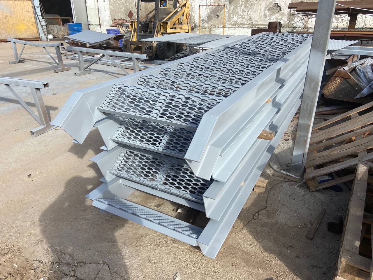 На фото — готовые марши с просечно-вытяжным листом (ПВЛ) на ступенях — это решение обеспечивает максимальное сцепление даже при наличии масла, воды или снега, что критически важно для безопасности на производстве.